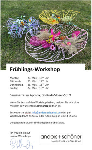 …dann, wenn es von der kreativen Kundin „gebraucht“ wird.Vor Ostern für Frühlingssträuße und Ostergestecke,im Sommer für wunderschöne Sommerblumensträuße,im Herbst, zur Erntezeitund natürlich vor dem Advent!Die 2- bis 3stündigen Workshops finden in meinem Seminarraum oder im Garten statt.10-15 Teilnehmerinnen sind dabei optimal.Natürlich komme ich auch gern zu Ihnen, wenn Sie mit Ihren Freunden, der Sportgruppe oder den Kolleginnen gemeinsam gestalten wollen.Sprechen Sie mich dazu gern an!Wenn Sie Lust auf den Workshop haben, melden Sie sich bitte an.Entweder als eMail info@anders-schoener.de oder per WhatsApp 0179-2927357 oder rufen mich an 03644-555955